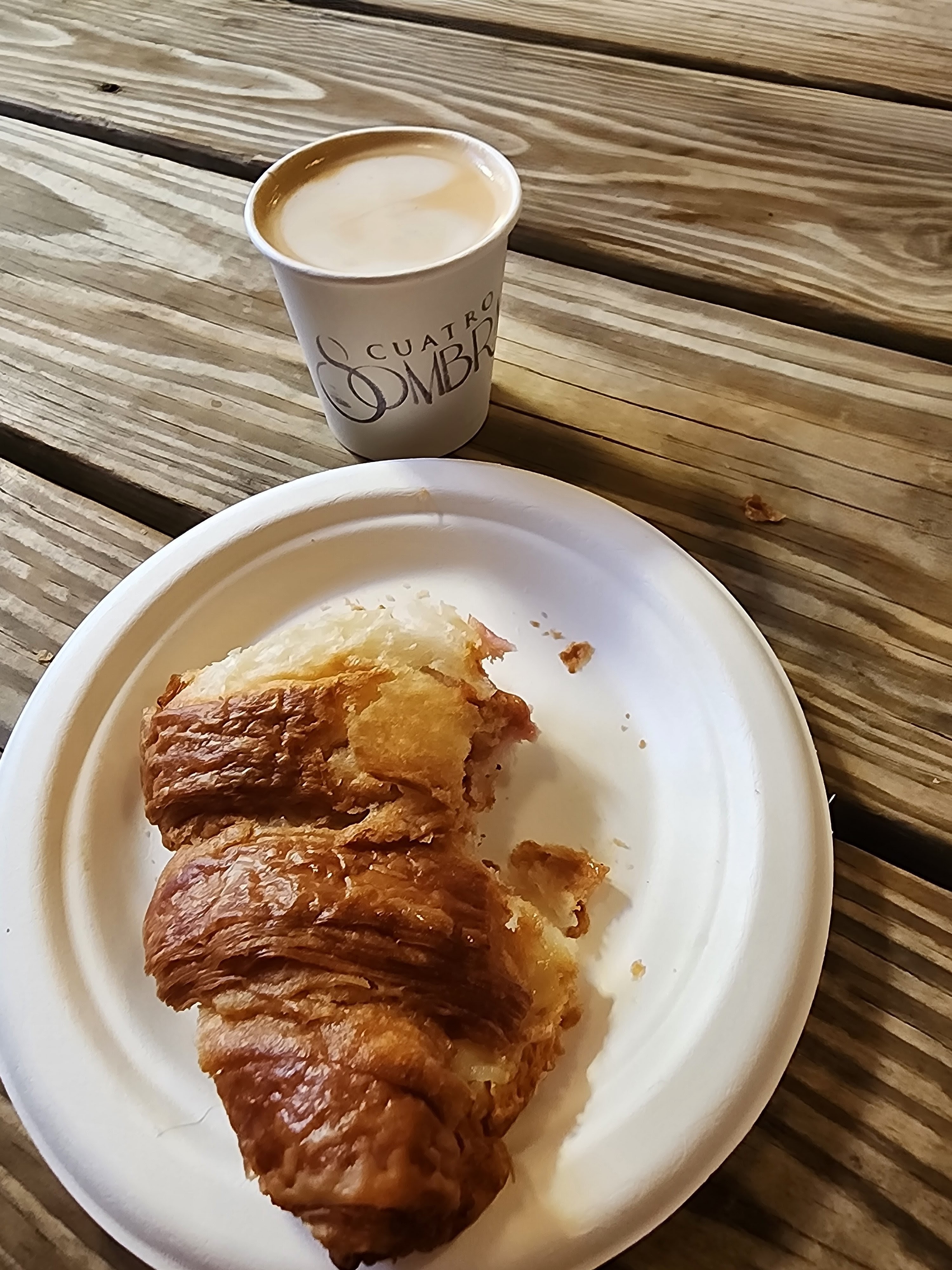 We had their version of macchiato, a cortadito, along with a croissant filled with Black Forest ham, Havarti cheese (both “non-local”) and guava butter (local, and excellent). Claudia talked us through their coffee, grown in the Yauco mountain region of Puerto Rico and medium-roasted right there. Behind us, big burlap sacks of green (unroasted) beans were stacked along the floor.