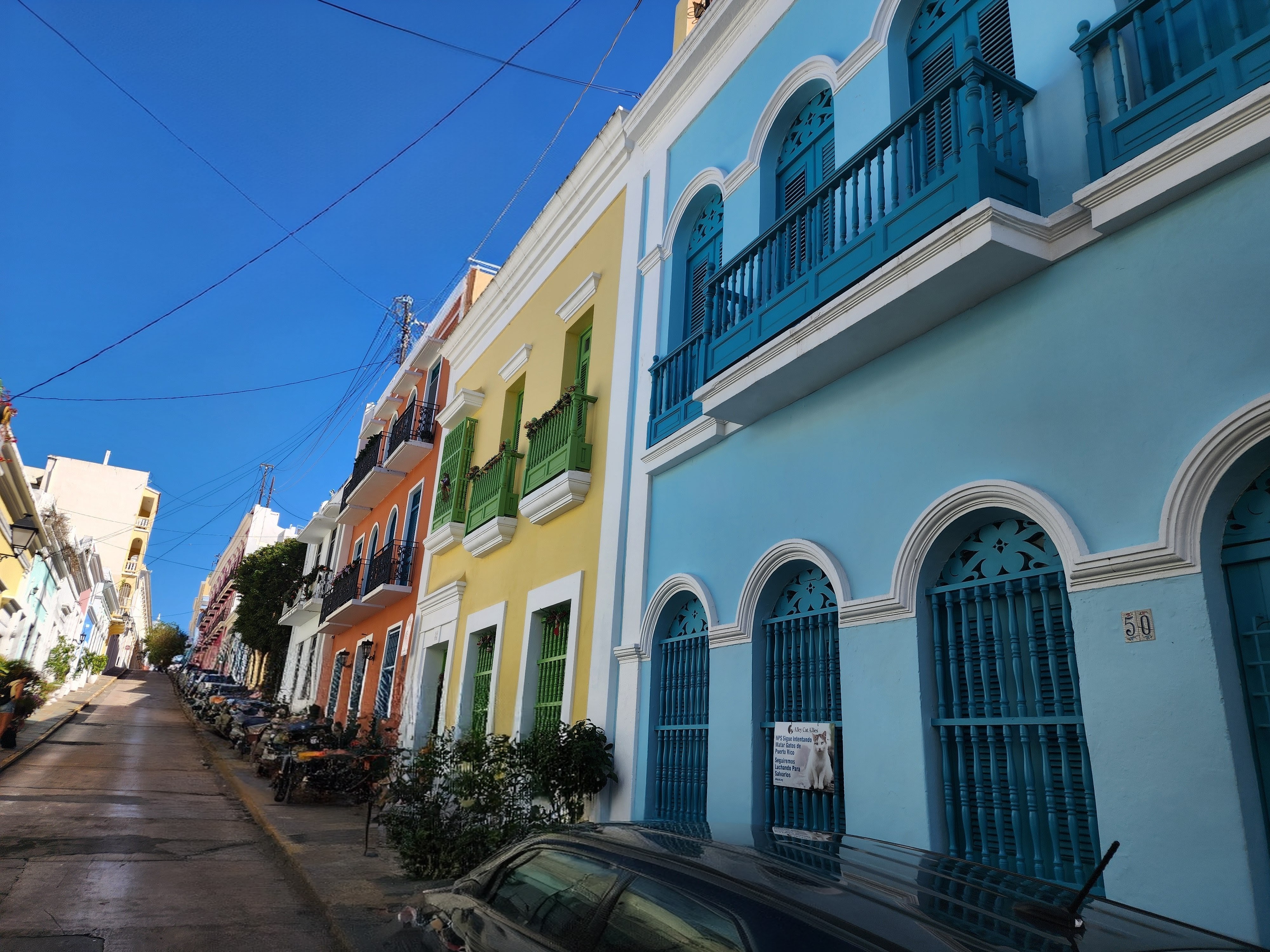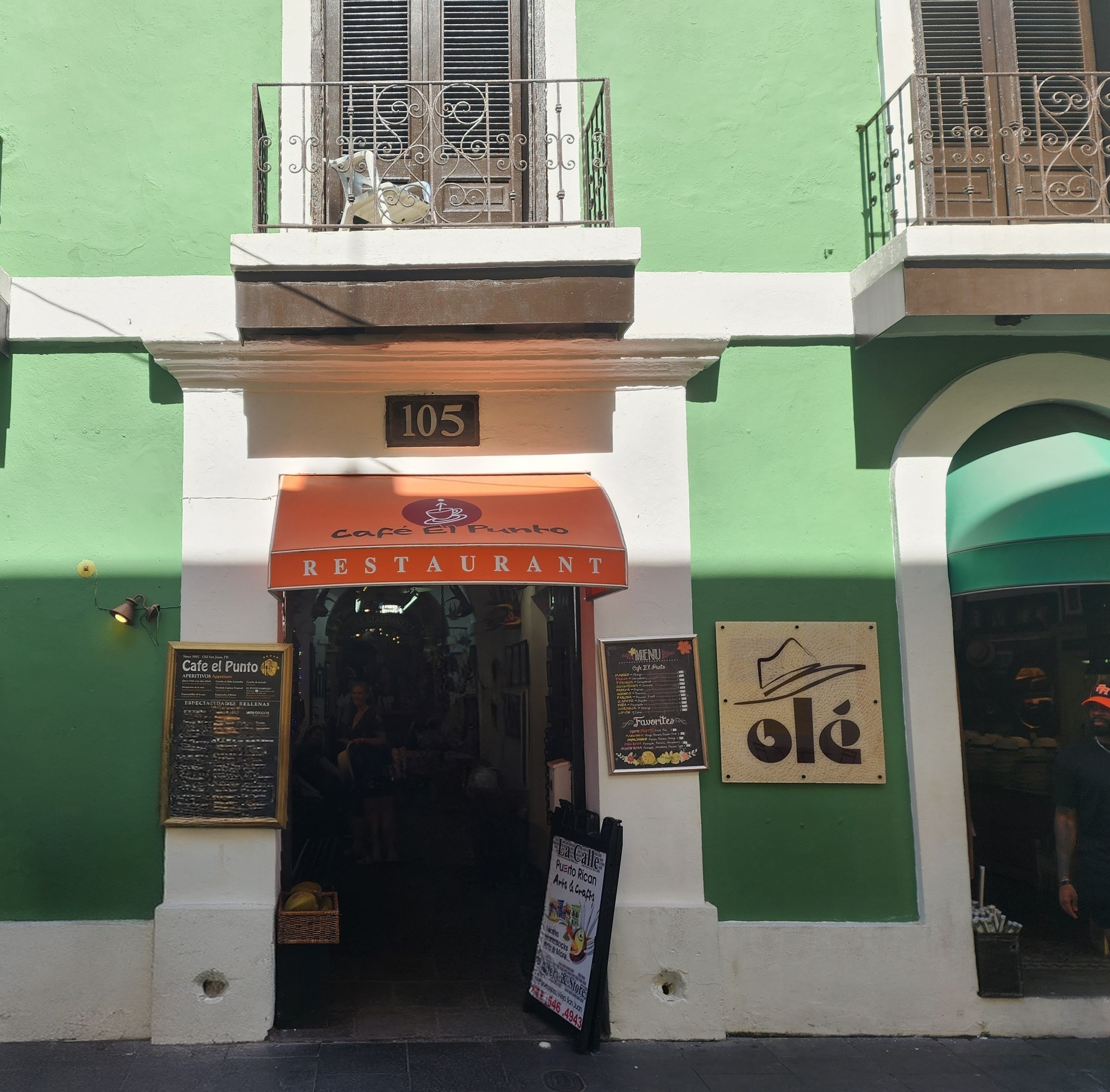 This restaurant sits in what used to be an alley. It was closed off in the 1800s as San Juan grew and needed more space. Homes were even built into these alleyways. Today the area is full of bright, cheerful colors — almost South Beach–like.