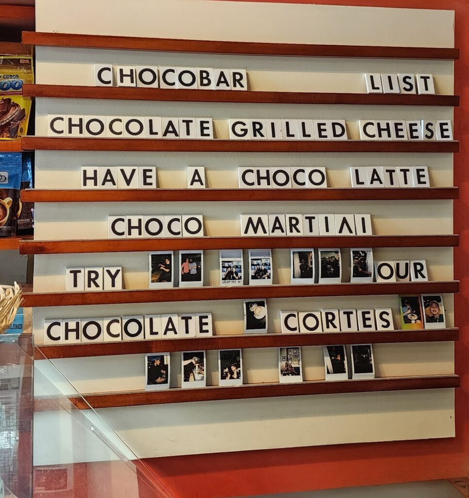 Dessert came at Chocobar Cortés, part of the Cortés family chocolate empire. The founder’s passion was simple: if it could possibly be made with chocolate, he wanted to make it. (I mean, who can dispute a man’s belief that “Everything goes with Chocolate?”) Chocolate grilled cheese. Curly fries with chocolate dipping sauce. Avocado toast with chocolate guacamole. Chocolate salt. Chocolate candles. Chocolate hot sauce.