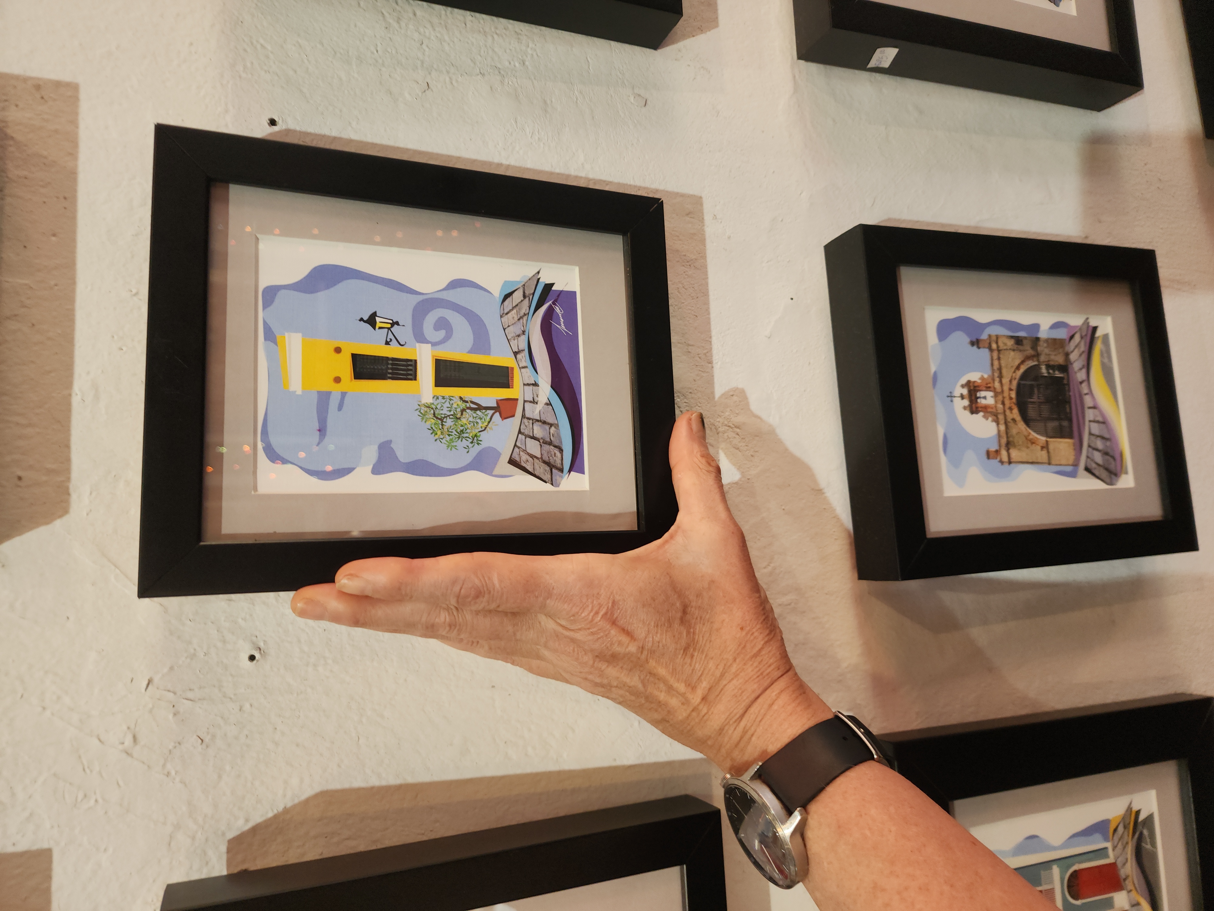 At the entrance, there’s a small gallery where I bought a piece of art depicting an impossibly thin, bright yellow “alley house,” and also a pair of drop crochet earrings that appear to have been made by fairies using individual hairs as needles.
