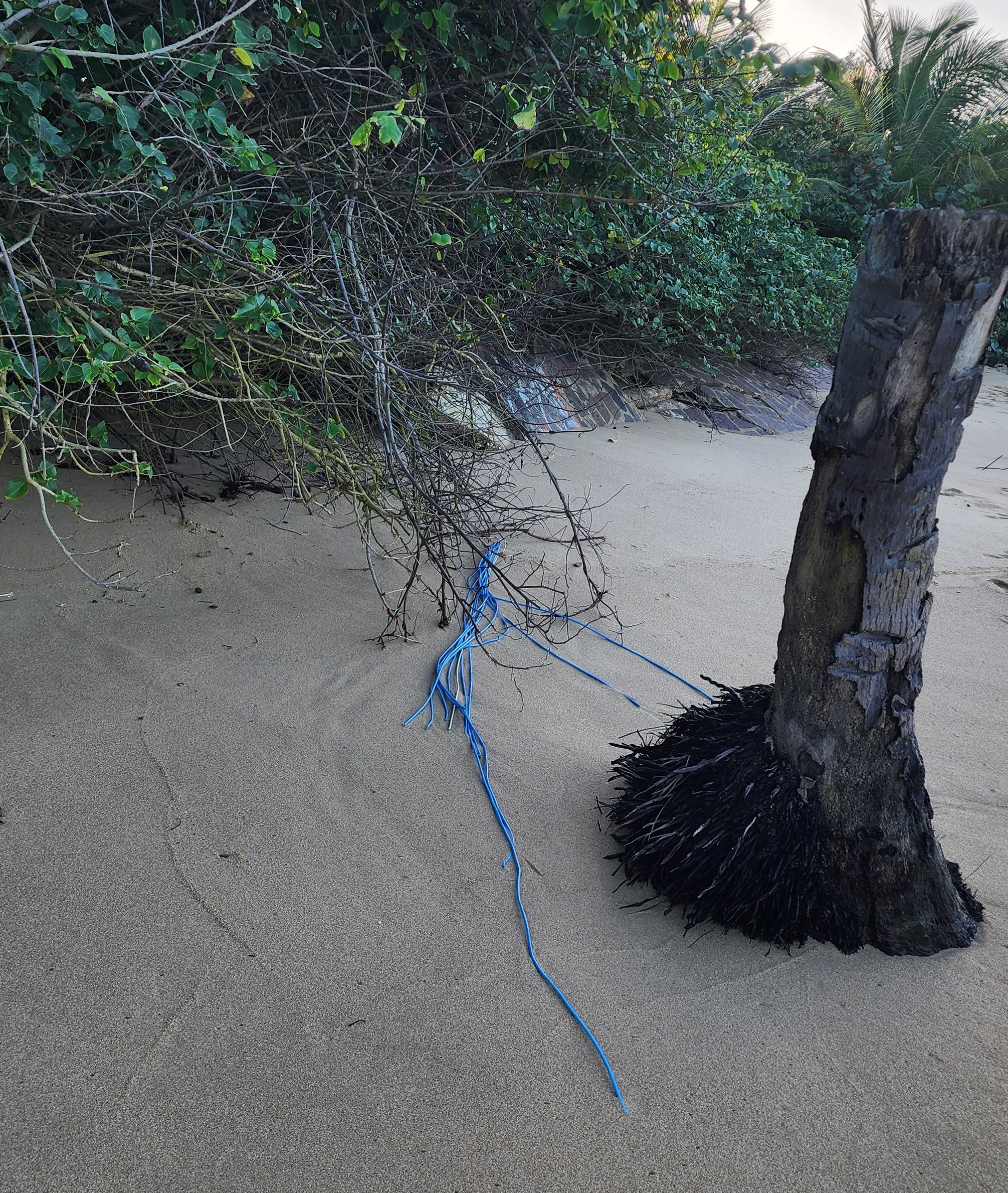 After a few hours of decompression, surf-listening, and general bliss, we walked down from the private beach toward the side of the cove. A local guy was sitting down there quietly with a coffee. From this angle, you can really see the lingering impact of Hurricane Maria.