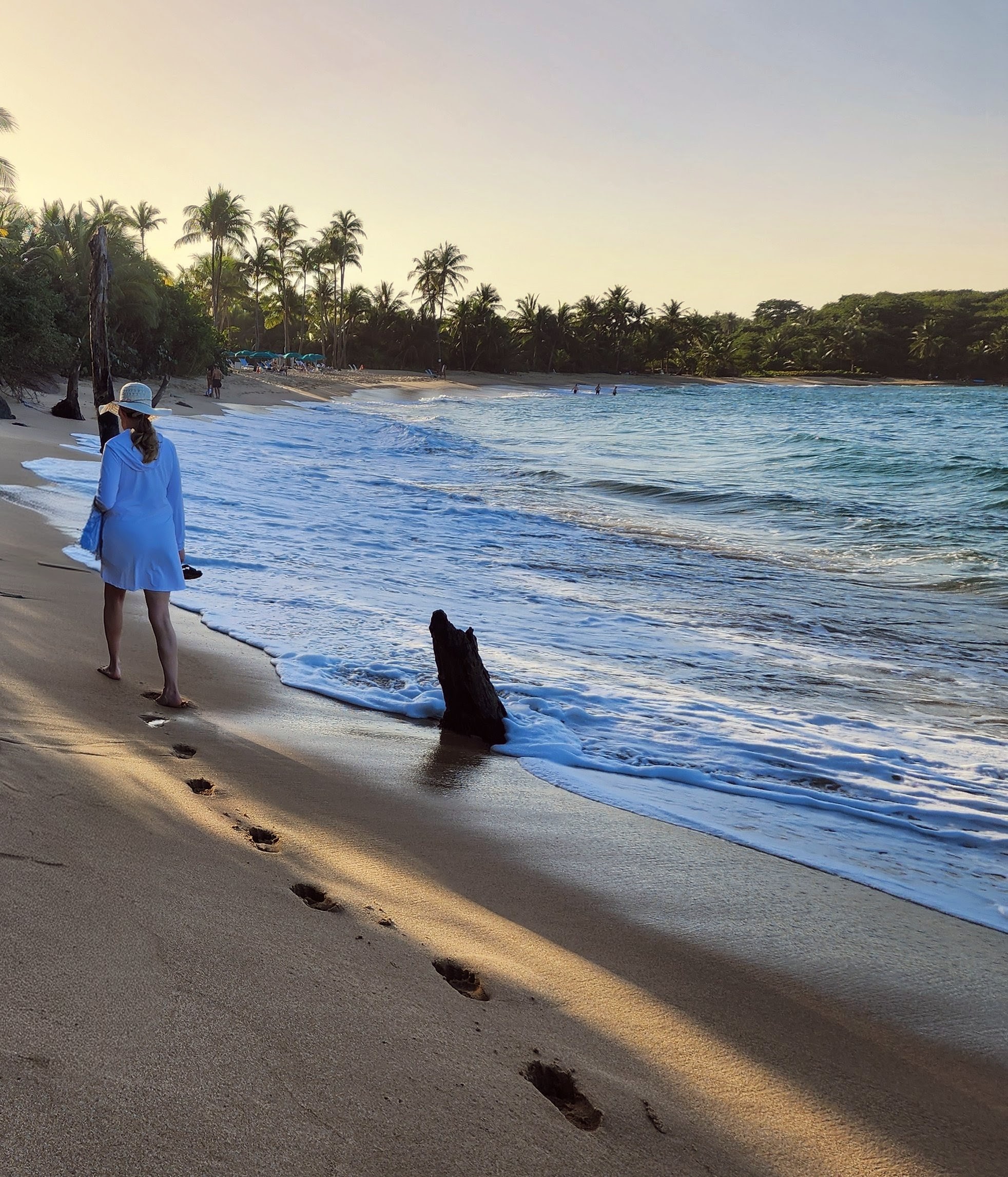 The weather is perfect, and the water that ideal “bathwater” temperature. There was a fairly strong undertow, but it only pulled you a bit away from shore. The waves were big and broke very close to the beach—shallow shelf, then a sudden drop-off.