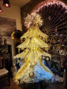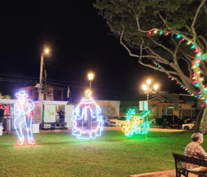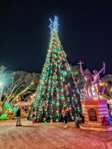 We decided we needed to walk off dinner and wound up at a nearby park hosting a Christmas festival. From a distance, it looked like the park held a massive Christmas tree in the middle, but it was actually long strands of lights and greenery arranged into a walk-through structure, with a crèche set inside.